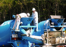モアークリートは、ごく少量・少作業で効果を発揮します。 添加量は生コン1㎥あたり0.8gで、投入後はミキサー車のアジテーター高速2~3回転で添加作業は完了します。